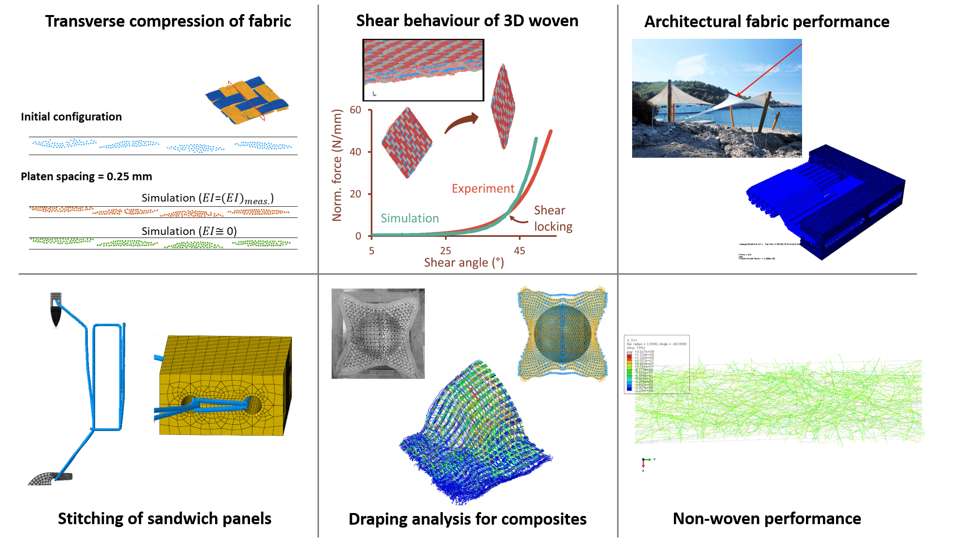Advanced material simulation is a key technology for engineers in industry. Material and process optimization are key factors that could improve textile production and application, especially with the quest for faster and better production processes as well as higher material performance in technical applications. Modelling of textile materials has long posed problems due to their complexity. We have therefore developed a new simulation method using finite element analysis which has the capability to simulate and predict the microstructure of textiles as well as their mechanical behaviour. The figure and list below give an impression of some applications developed using this method: