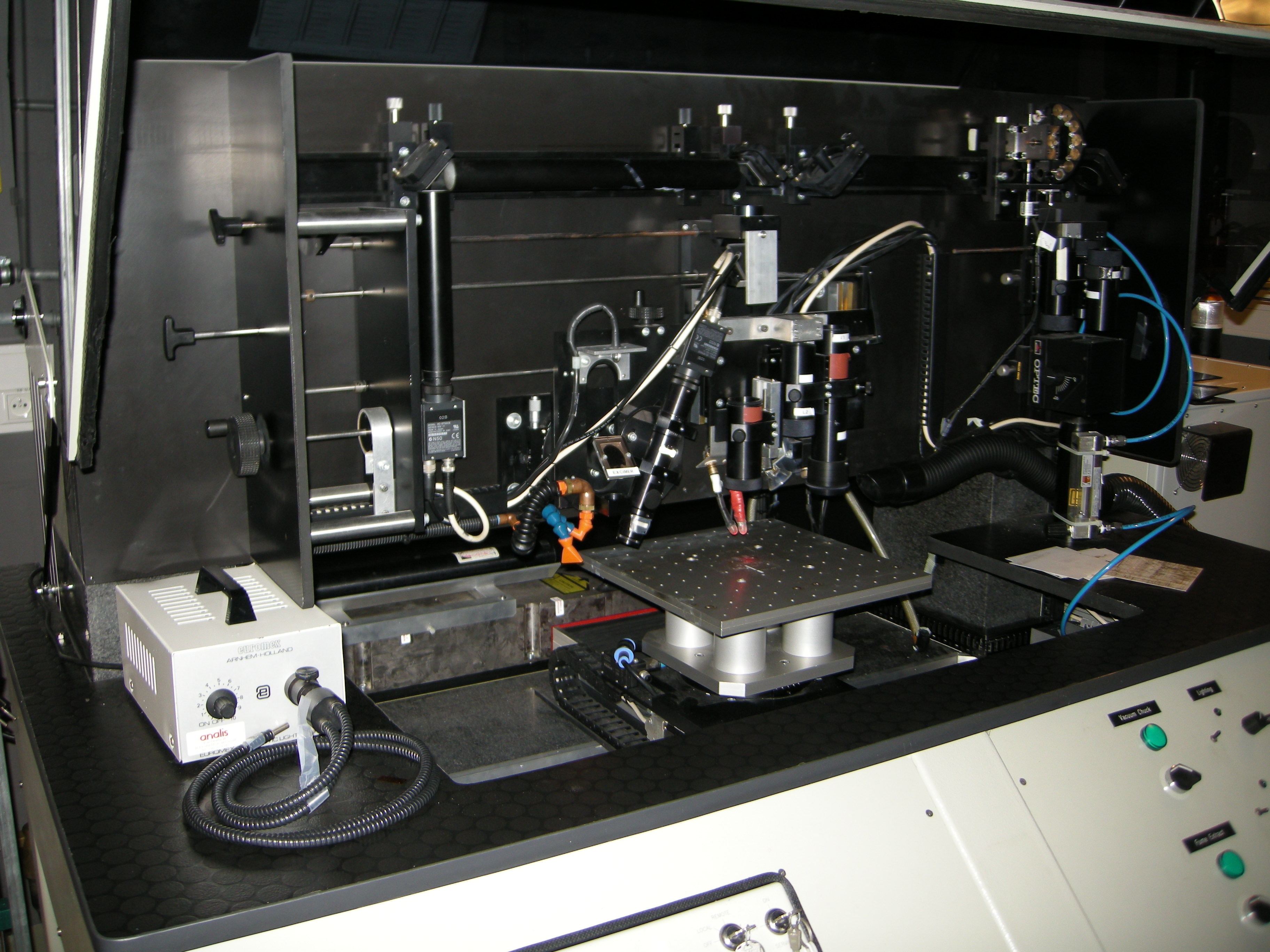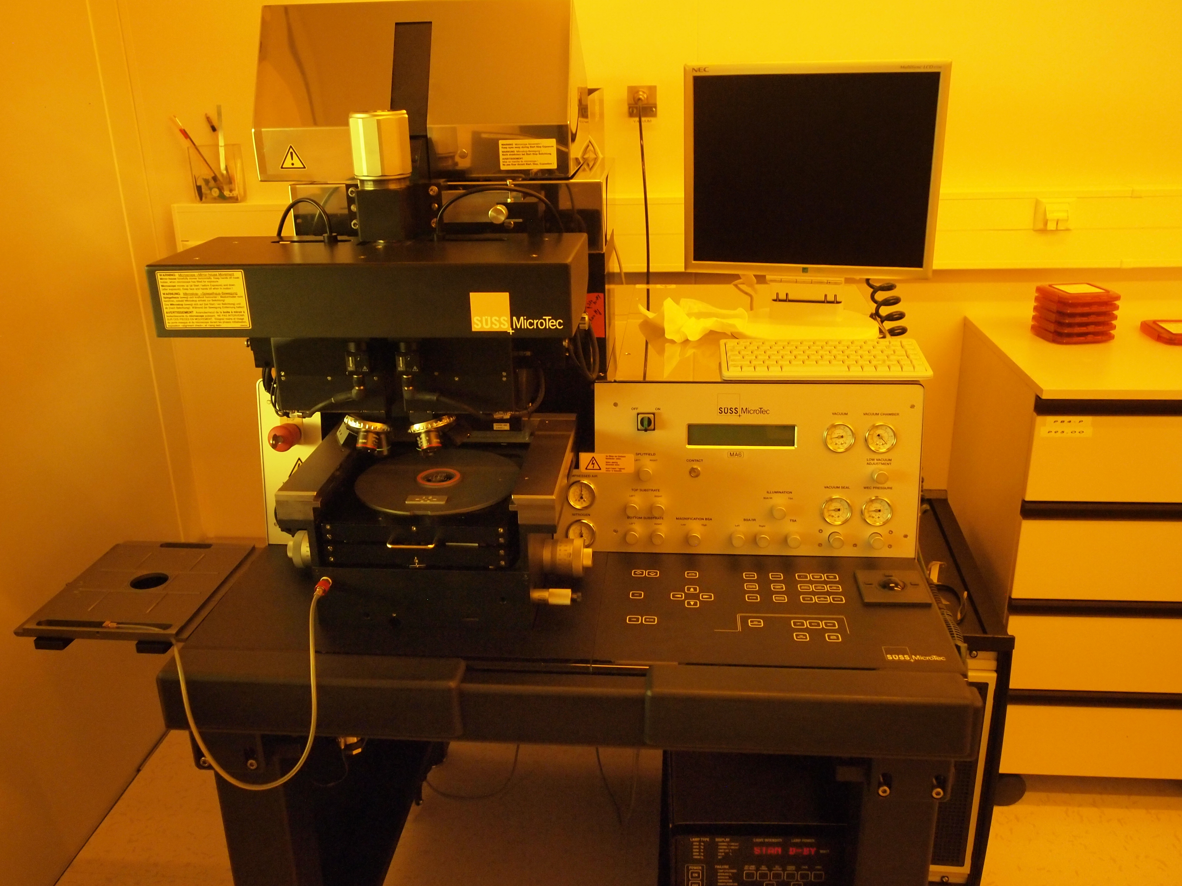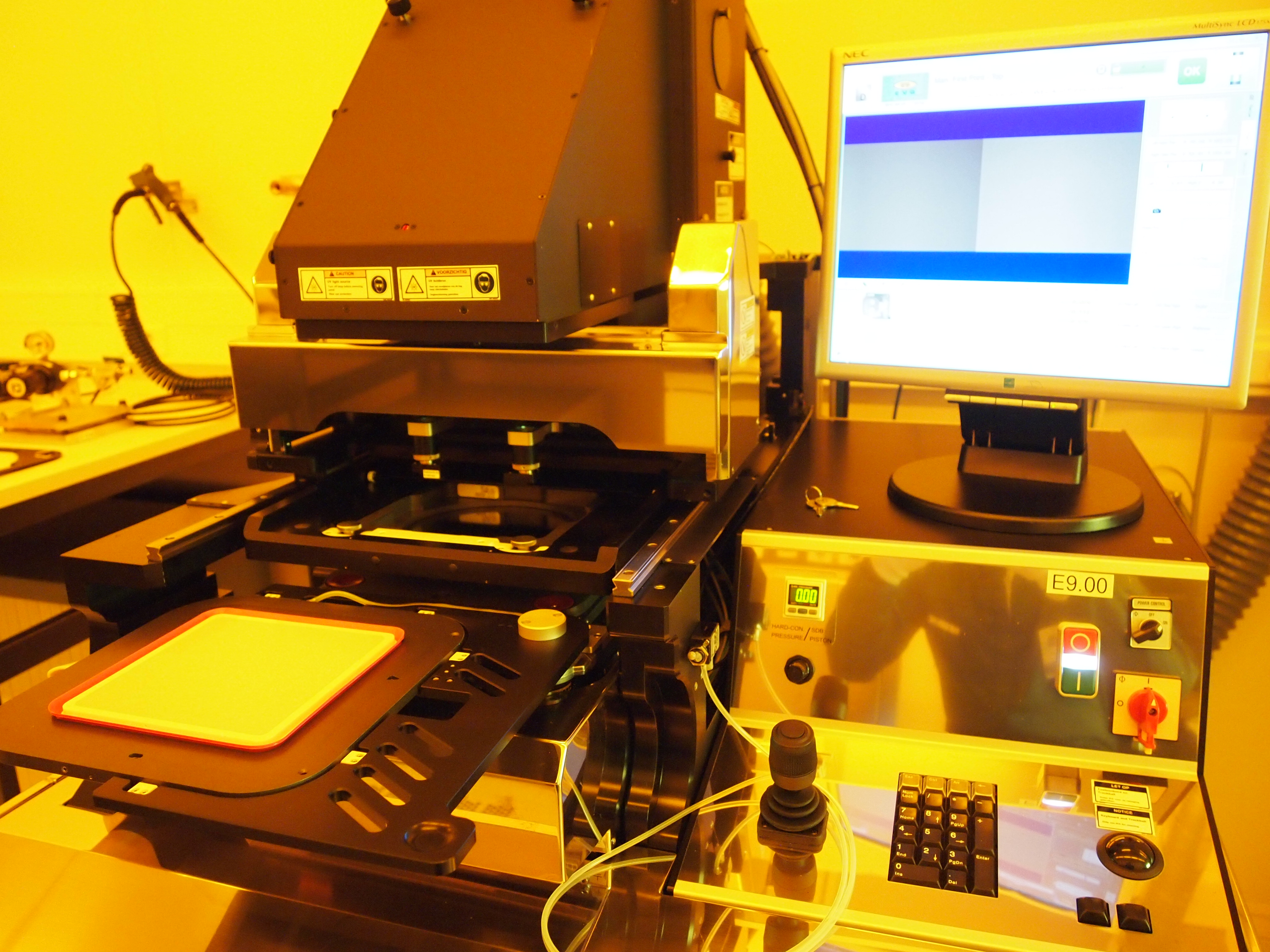 The mask aligner is used to transfer a pattern to a photosensitive material by selective exposure (through a mask) to a UV radiation source. The equipment supports several modes (proximity, soft / hard / vacuum contact) and can also do bottom side alignment. It can also be used in nano-imprint mode, where the pattern is transferred by imprinting.
