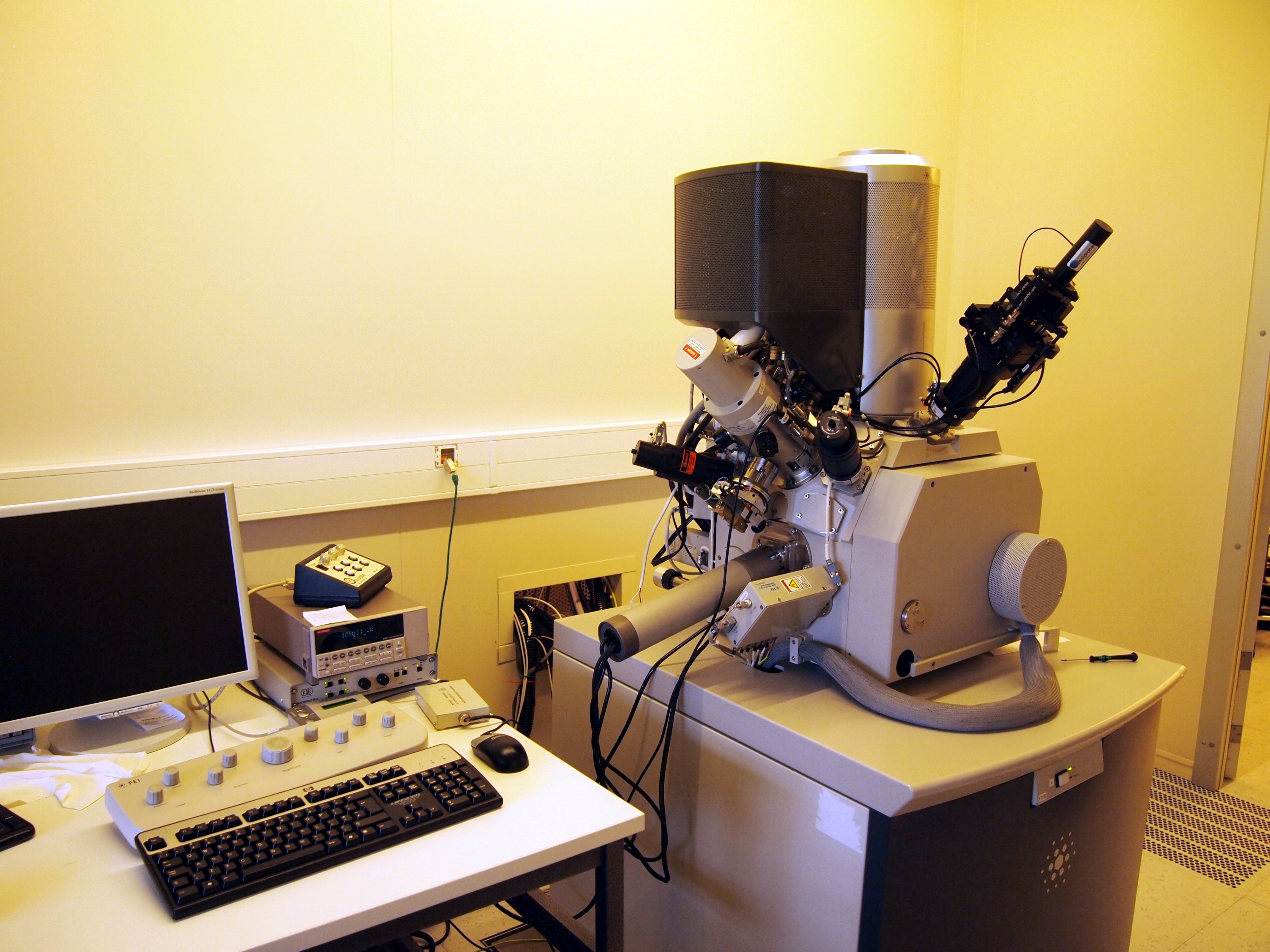 SEM (Scanning Electron Microscope) can be used for inspection of samples with resolution down to nanometer scale. The FIB (Focused Ion Beam) column can be used for making cross-sections in virtually any material and gives the option to look "into" the material. FIB also allows to directly pattern materials with nanometer resolution. Options include electron backscatter diffraction (EBSD, for evaluation of microstructure of material), several etch gas injectors, Auto-slice&View and nanomanipulators for TEM-slice preparation.