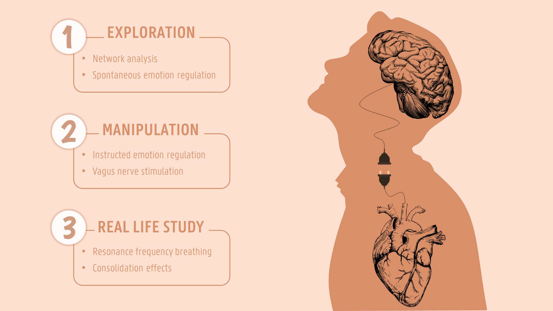 The first phase of the project is exploratory, in which a network analysis on existing ERSQ data and an experimental study on spontaneous emotion regulation will be executed. In a second phase, two lab studies with experimental manipulation will take place. One on instructed emotion regulation (relax, accept and regulate) and one on different ways of vagus nerve stimulation. In the last phase, a study will investigate the consolidation effects and ecological validity of resonance frequency breathing.