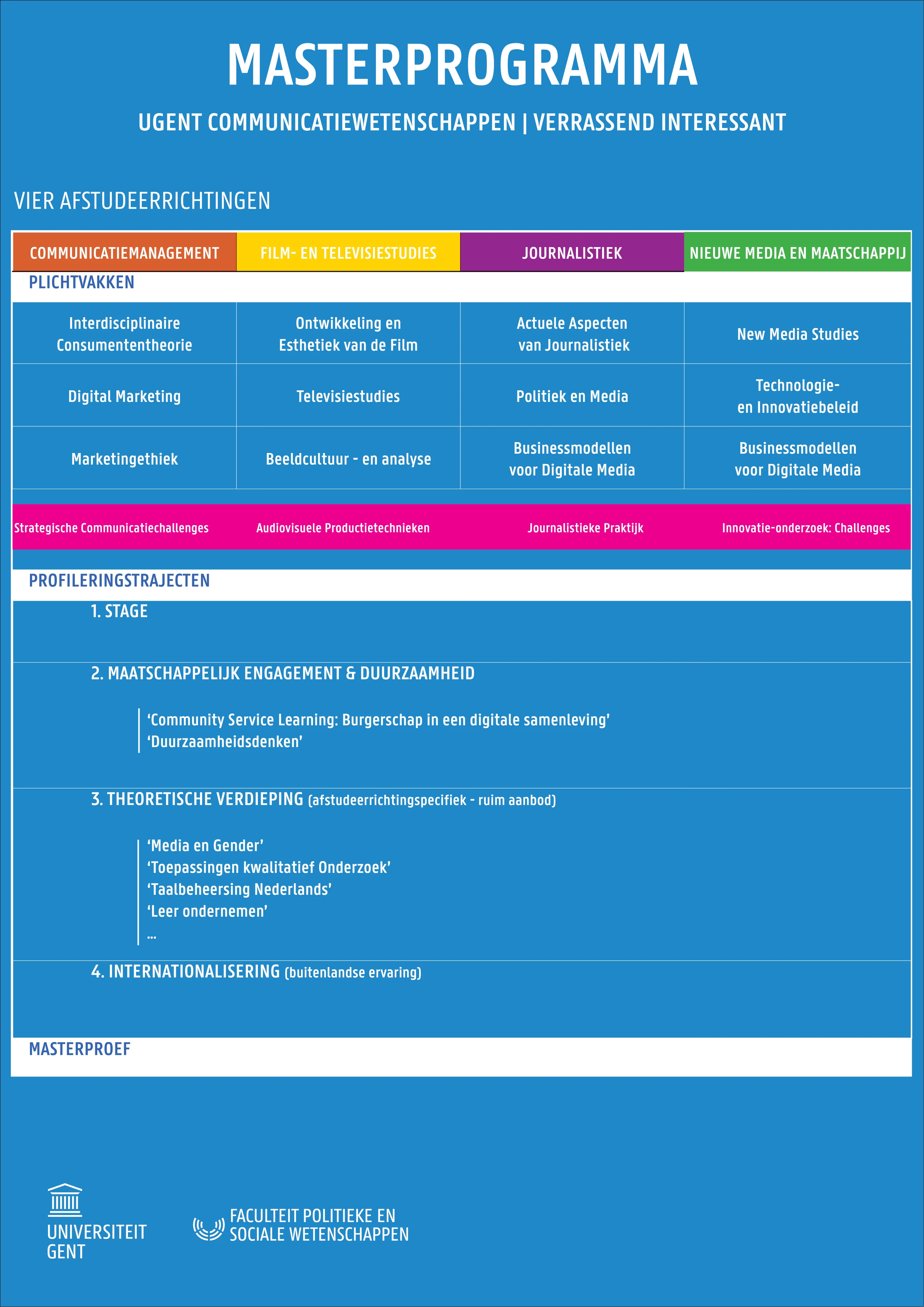Op dit punt profileert de UGent-opleiding zich op masterniveau duidelijk ten aanzien van de andere universiteiten die een opleiding in de Communicatiewetenschappen aanbieden. Elk van de afstudeerrichtingen wordt namelijk onderbouwd door een specifiek onderzoekscentrum: