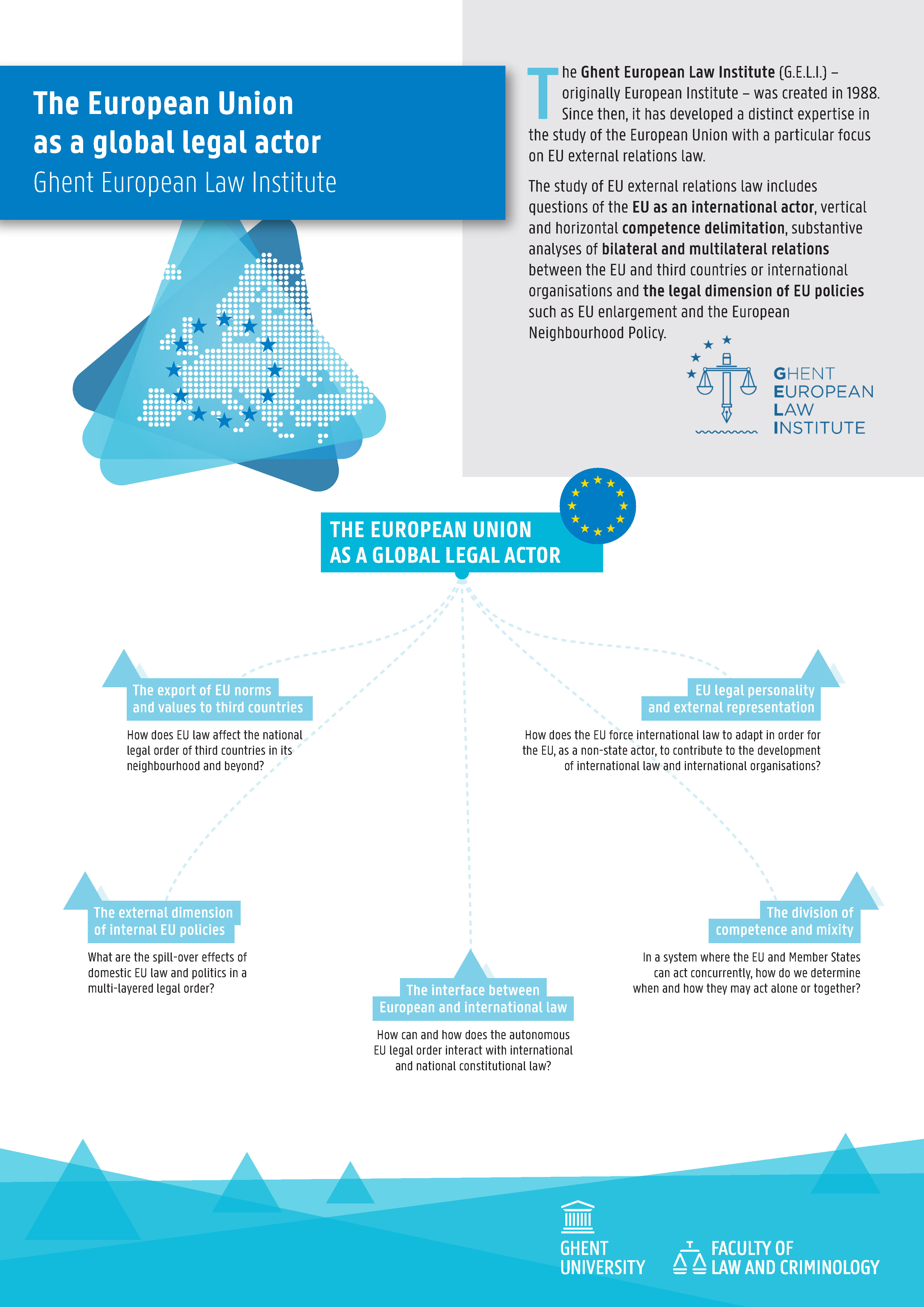 The Ghent European Law Institute (GELI), is part of the Faculty of Law of Ghent University, and is integrated in the Jean Monnet Centre of Excellence (JMCE). It receives financial support from the European Institute, which was founded by prof. Marc Maresceau in 1988.