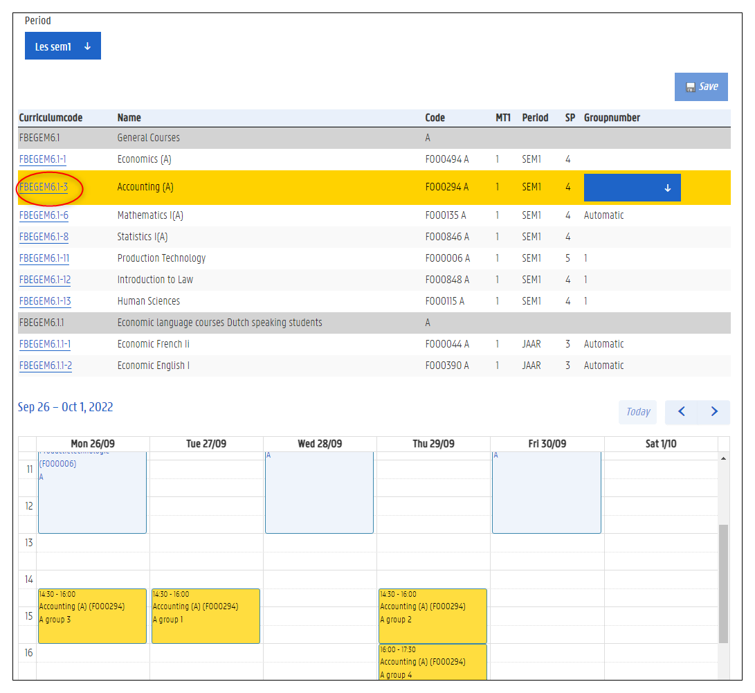 A list of all the courses in your curriculum appears, for the selected period. A blue drop down menu is available next to the courses of which you can choose the group yourself. - Click on the curriculum code of the course in the left column. All the activities of all the groups of this course are shown in the calendar on the lower half of the screen.