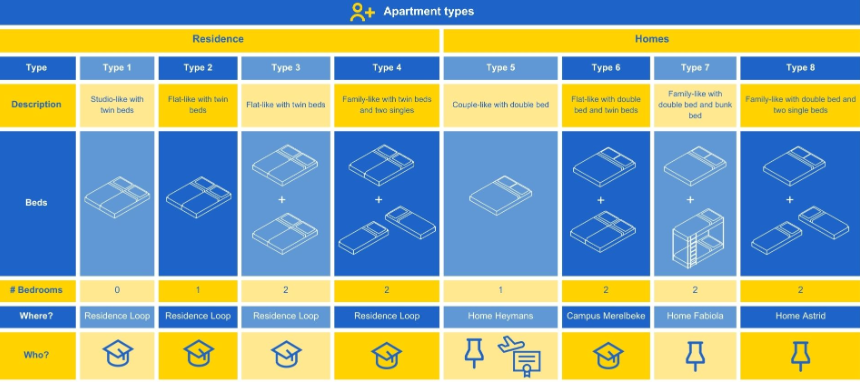 OPGELET: Homes Astrid en Fabiola worden vanaf september 2026 gerenoveerd. Studenten die zo'n kamer huren, zullen voorrang krijgen om naar een ander kot te verhuizen. Home Vermeylen wordt gerenoveerd vanaf september 2028.