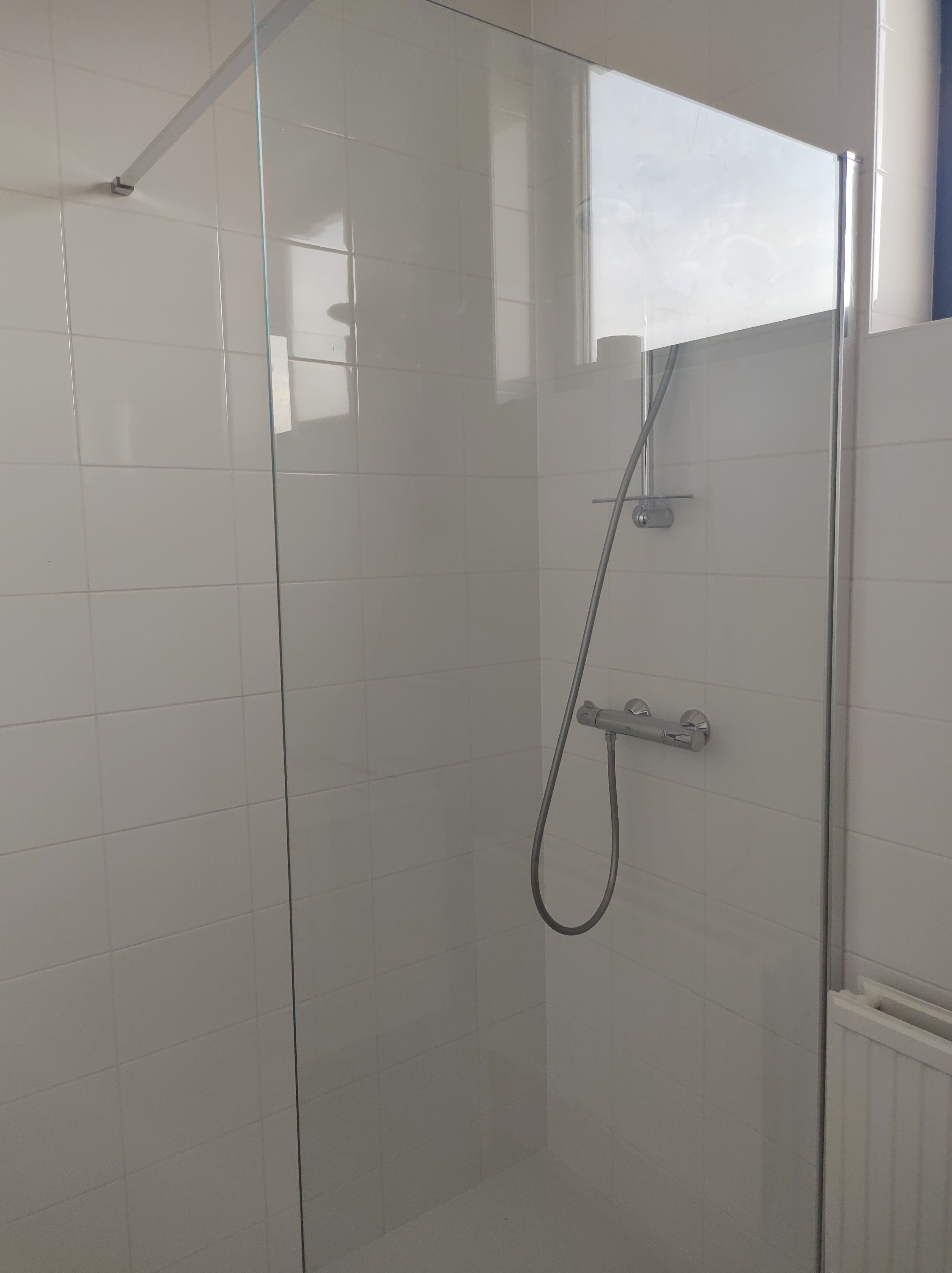 - Bathroom with shower, wash basin, toilet and washing machine.