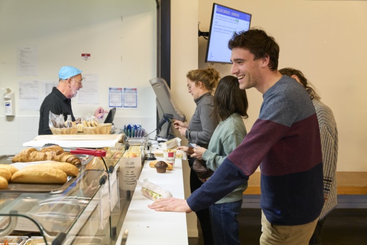 De cafetaria bevindt zich in de kelder, ingang via de trap tussen auditorium 1 en 2.
