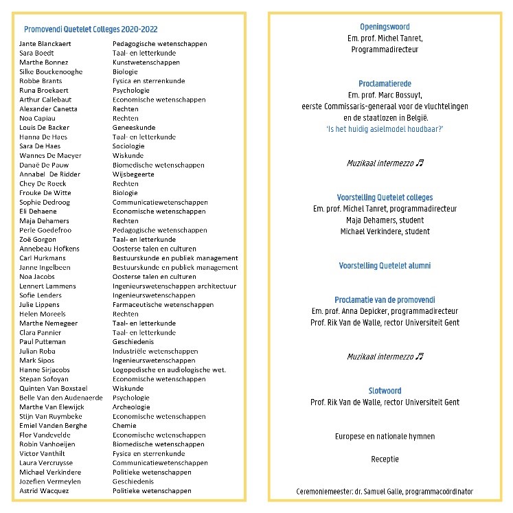 Jante Blanckaert: Pedagogische Wetenschappen Sara Boedt: Taal- en letterkunde Frans-Spaans Marthe Bonnez: Kunstwetenschappen Silke Bouckenooghe: Biologie Robbe Brants: Fysica en Sterrenkunde Runa Broekaert: Psychologie Arthur Callebaut: Economische Wetenschappen Alexander Canetta: Rechten Noa Capiau: Rechten Louis De Backer: Geneeskunde Hanna De Haes: Taal- en letterkunde: N. – Fr. Sara De Haes: Sociologie Wannes De Maeyer: Wiskunde Danaë De Pauw: Biomedische wetenschappen Annabel De Ridder: Wijsbegeerte Chey De Roeck: Rechten Frouke De Witte: Biologie Sophie Dedroog: Communicatiewetenschappen Eli Dehaene: Economische Wetenschappen Maja Dehamers: Rechten Perle Goedefroo: Pedagogische wetenschappen Zoë Gorgon: Taal- en Letterkunde: Fr.-D Annebeau Hofkens: Arabistiek en Islamkunde Carl Hurkmans: Bestuurskunde en Publiek Management |
