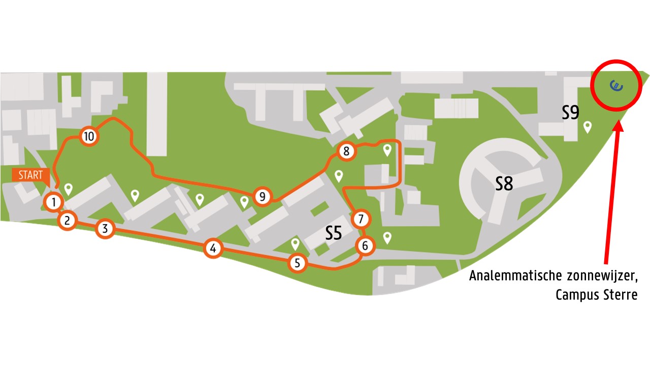 De analemmatische zonnewijzer op Campus Sterre bevindt zich op de meest zuidelijke en zonrijke plek van de campus: in het grasveld naast gebouw S9. De zonnewijzer is makkelijk bereikbaar door het looppad langs S8 en achter S9 te volgen, evenwijdig met de Krijgslaan.