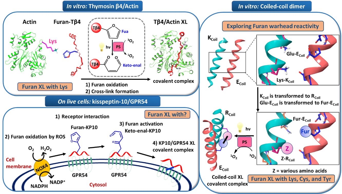 Initially, we studied the weak and dynamic protein-protein interaction between actin and Tß4 that regulates the polymerization of actin and keeps actin in the monomeric form. Furan-armed-Tß4 analogues were shown to efficiently cross-link to monomeric actin upon singlet oxygen generation1. The cross-link in the Tß4-actin covalent complex was to involve Tß4-Fua24 and Actin-Lys611. A coiled-coil peptide dimer was used as a model system to explore furan reactivity, we described for the first-time reaction of the activated furan warhead with cysteine and tyrosine, besides the previously reported lysine, thus enhancing the versatility of the furan cross-link technology by the possibility to target different amino acids2. The furan-oxidation mediated cross-link technology was further optimized to enable cross-linking of furan-modified peptide ligands to GPCR proteins on live cells relying on the spontaneous endogenous oxidation of the furan moiety. We studied the neuropeptide kisspeptin-10 and its G-protein coupled receptor GPR54. We described selective cross-linking of a furan-modified kisspeptin-10 analogue to its membrane receptor GPR54 in live cells, with no toxicity and high efficiency3,4.
