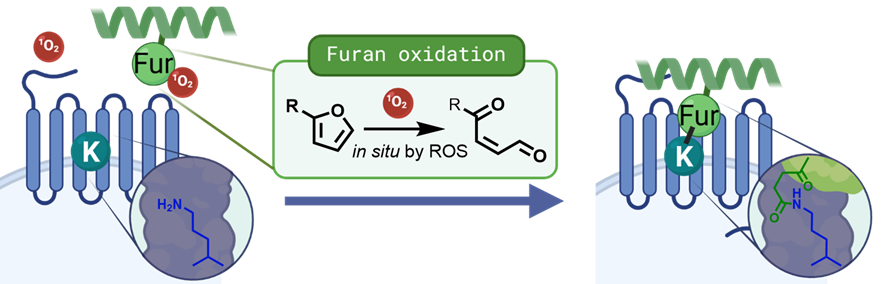 The furan oxidation technology, illustrated in figure 1, is a selective, spatiotemporally controlled covalent crosslinking methodology already applied on DNA, RNA and small protein-protein interactions. In this PhD research, this crosslinking methodology is applied to trap peptide-protein interactions at the cell surface in order to pave the pathway towards covalent peptide/protein therapeutics.
